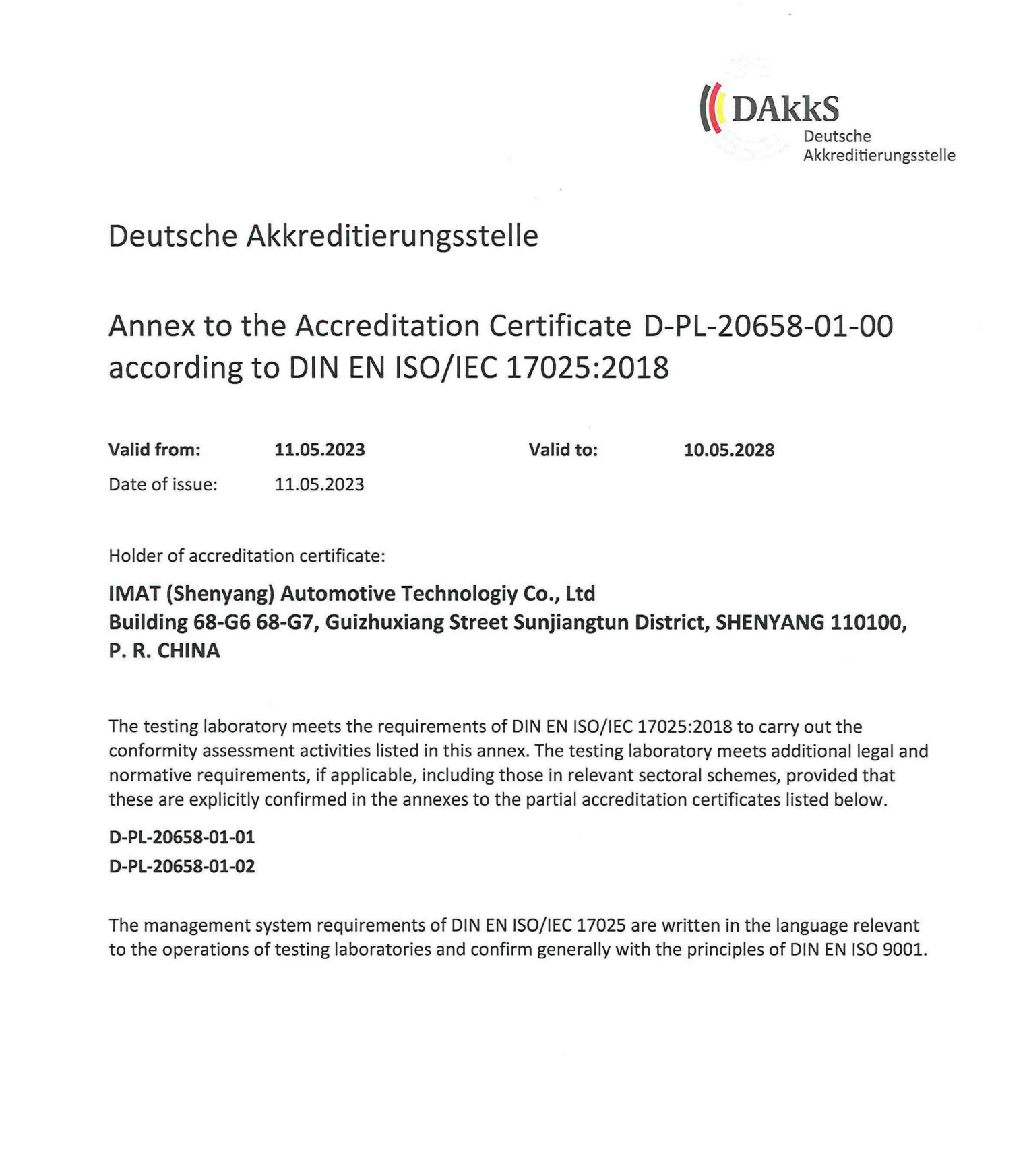 Akkreditierung gemäß ISO/IEC 17025 (Shenyang/ China)
